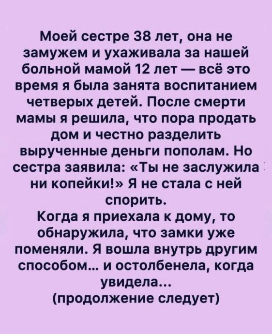 Моей сестре было уже тридцать восемь. Она так и не вышла замуж, полностью посвятив себя уходу за нашей тяжело больной матерью долгие двенадцать лет. Я же всё это время растила четверых детей и не могла помогать так, как она. После смерти мамы я решила, что самое честное — продать её дом и разделить вырученные деньги пополам. Но сестра холодно сказала: