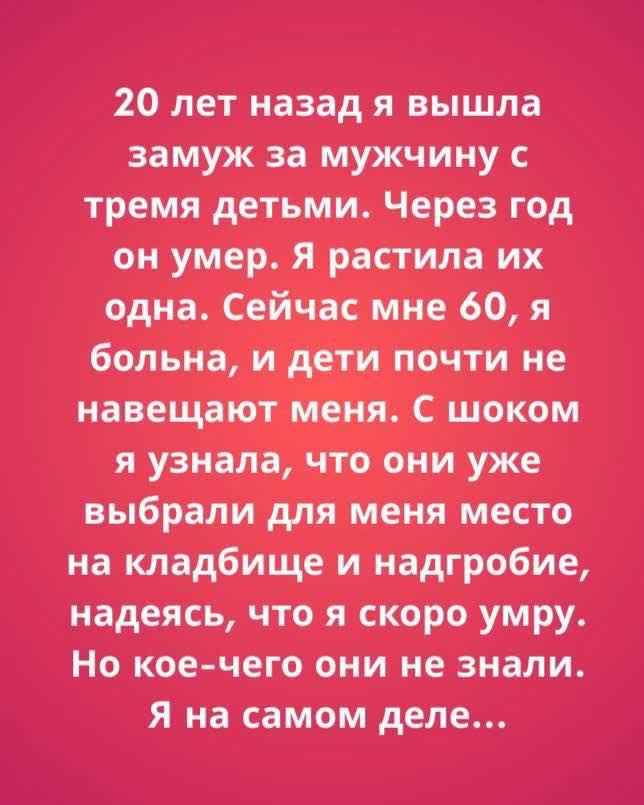Она рассказала, что мои дети уже выбрали для меня место на кладбище.