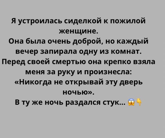 Перед своей смертью она крепко взяла меня за руку и произнесла: «Никогда не открывай эту дверь ночью».