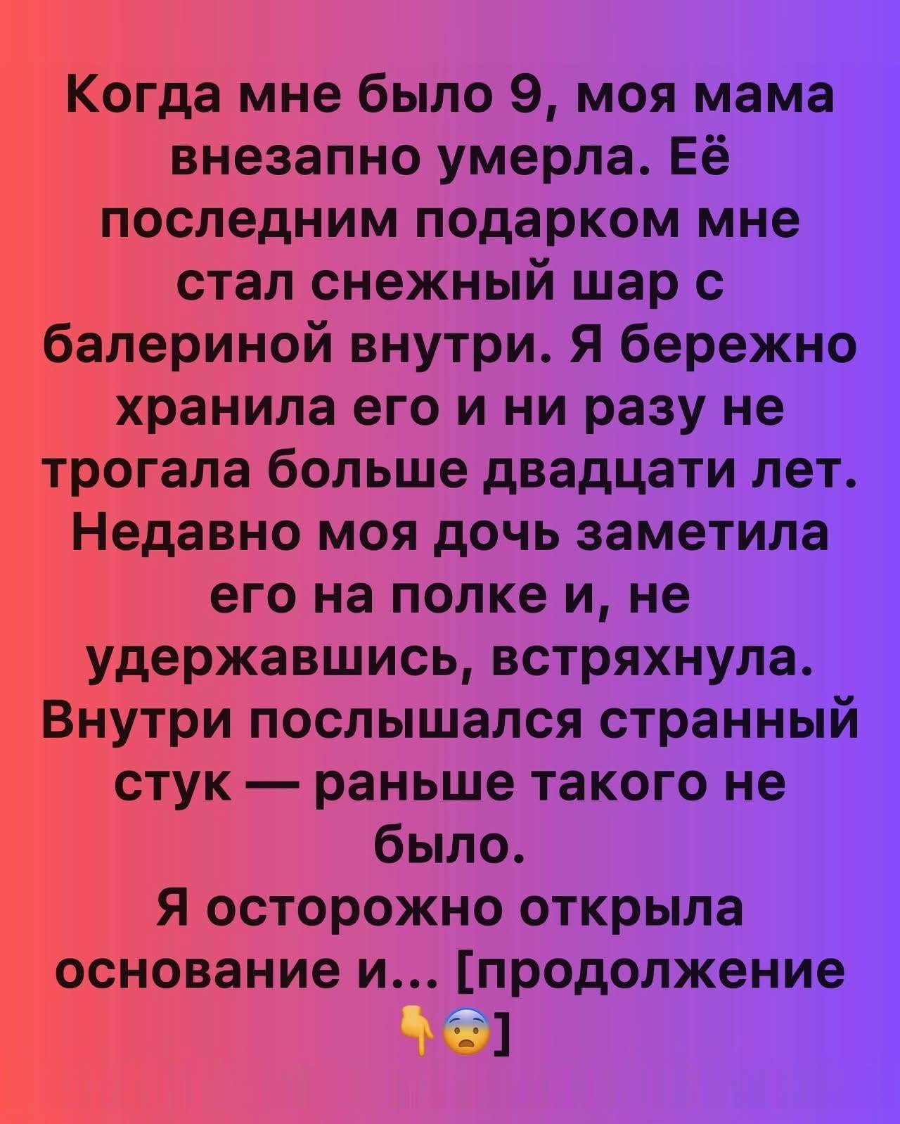 «Балерина внутри шара — не просто игрушка. Она хранит то, что я не могла доверить никому. Пожалуйста, будь осторожна. И если однажды ты услышишь стук — значит, пришло время».