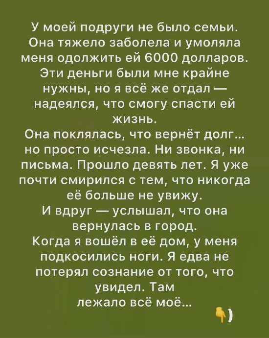 Теперь я точно знаю, что лежало — и лежит — в этом доме: не деньги, не обиды и не долги. Здесь лежит то, ради чего вообще стоит жить: шанс быть для кого-то тем самым человеком, который даст руку, когда мир рушится.