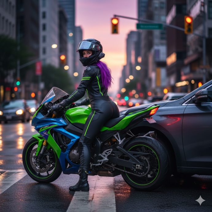 Внезапно его внимание привлёк яркий мотоцикл, остановившийся на красный свет. За рулём сидела девушка в обтягивающем костюме, подчёркивающем стройную фигуру. Неожиданно сзади её слегка толкнула машина. Мотоциклистка обернулась и показала водителю большой палец, видимо, намекая на неосторожность.