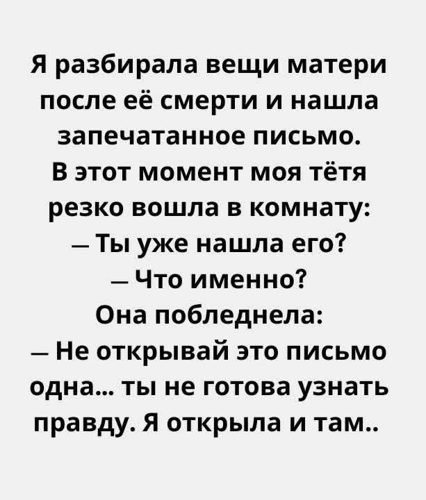 «Если ты читаешь это письмо, значит, меня уже нет. Прости меня за ложь, которую я хранила всю твою жизнь. Ты — не та, кем себя считаешь…»