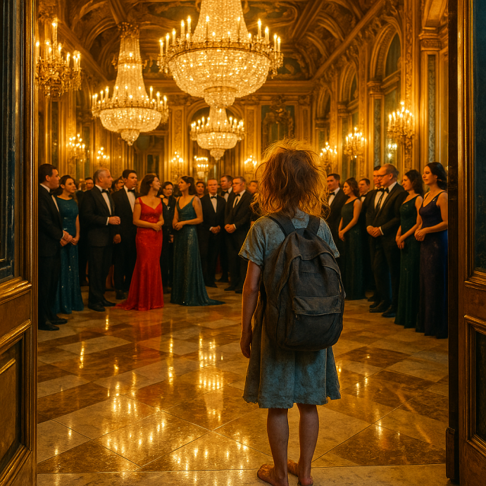 Бальный зал отеля утопал в роскоши. Хрустальные люстры рассыпали свет по отполированному мраморному полу, где отражались, словно звёзды, отблески позолоты и зеркал. Здесь проходил благотворительный вечер под названием «Шанс для молодёжи» — собрались миллионеры, бизнесмены, политики, актрисы в вечерних платьях. Все говорили о помощи детям, о добре и будущем. Но лишь одна девочка в этом зале знала, что значит настоящий голод.