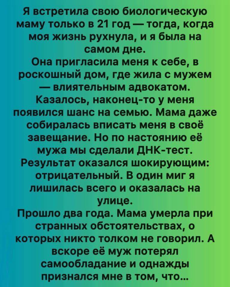 До этого дня моя биологическая мать была для меня не человеком, а пустотой. Белым пятном в документах. Словом, которое произносили шёпотом. Меня удочерили младенцем, и приёмные родители сделали всё, что могли. Но любовь не всегда заменяет правду. А когда они умерли один за другим, я осталась одна — с вопросами, которые больше некому было задавать.