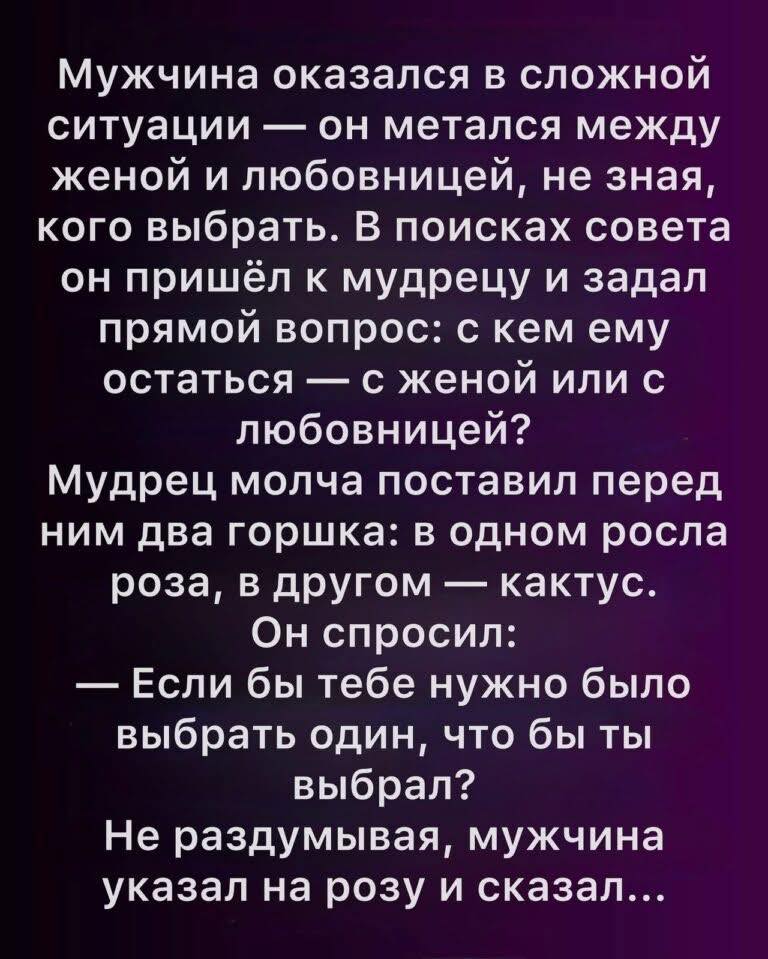 — Учитель, — сказал он, не поднимая глаз, — я оказался в сложной ситуации. Моё сердце разрывается. Я метаюсь между женой и женщиной, которую люблю иначе. Я не знаю, кого выбрать. Я устал. Прошу, скажи мне, как поступить.
