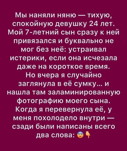 Мы наняли няню — тихую, уравновешенную девушку двадцати четырёх лет. Мой семилетний сын сразу полюбил её и почти не расставался: начинал плакать и кричать, если она уходила хотя бы на минуту. Но вчера, случайно заглянув в её сумку… я обнаружила там ламинированную фотографию моего сына. Перевернув её, я почувствовала, как холод пробежал по спине: на обратной стороне были написаны всего два слова.