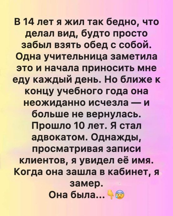 — Когда-то одна учительница кормила меня, потому что я был слишком гордым, чтобы признаться, что голоден. Сегодня я адвокат. И если вы здесь сидите и думаете, что вас никто не видит — это неправда. Вас видят. И иногда ваша жизнь может измениться из-за одного бутерброда.