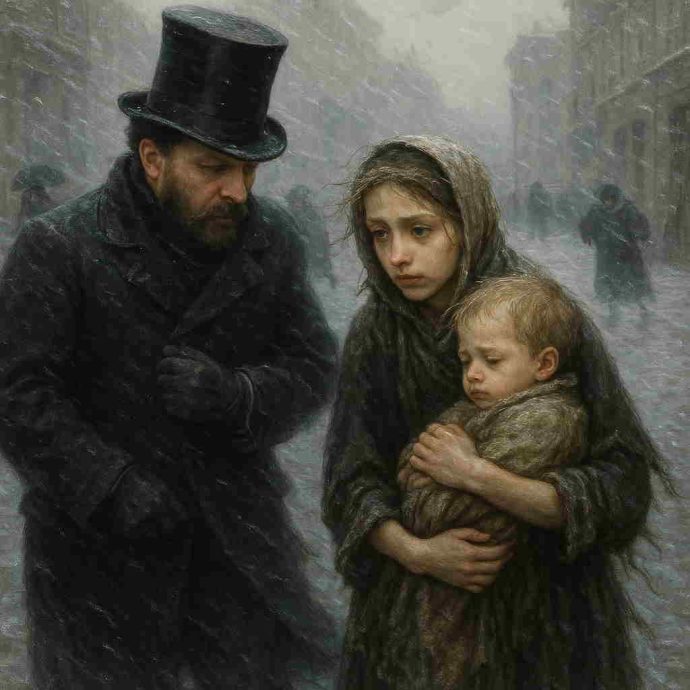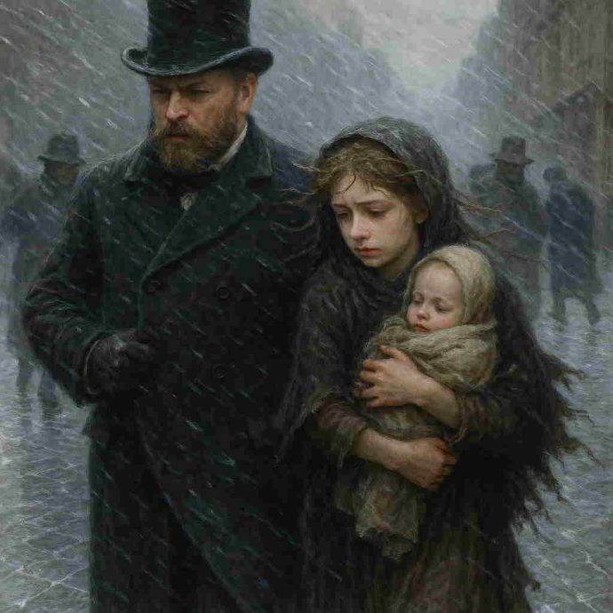 Девочка выполняла любые мелкие поручения — мыла витрины, таскала пакеты, чистила обувь прохожим. Люди редко смотрели ей в глаза, но она не жаловалась. Главное — не дать брату умереть с голоду. Иногда ей казалось, что снег вокруг — это не просто холод, а испытание, которое нужно пройти, чтобы сдержать данное обещание.