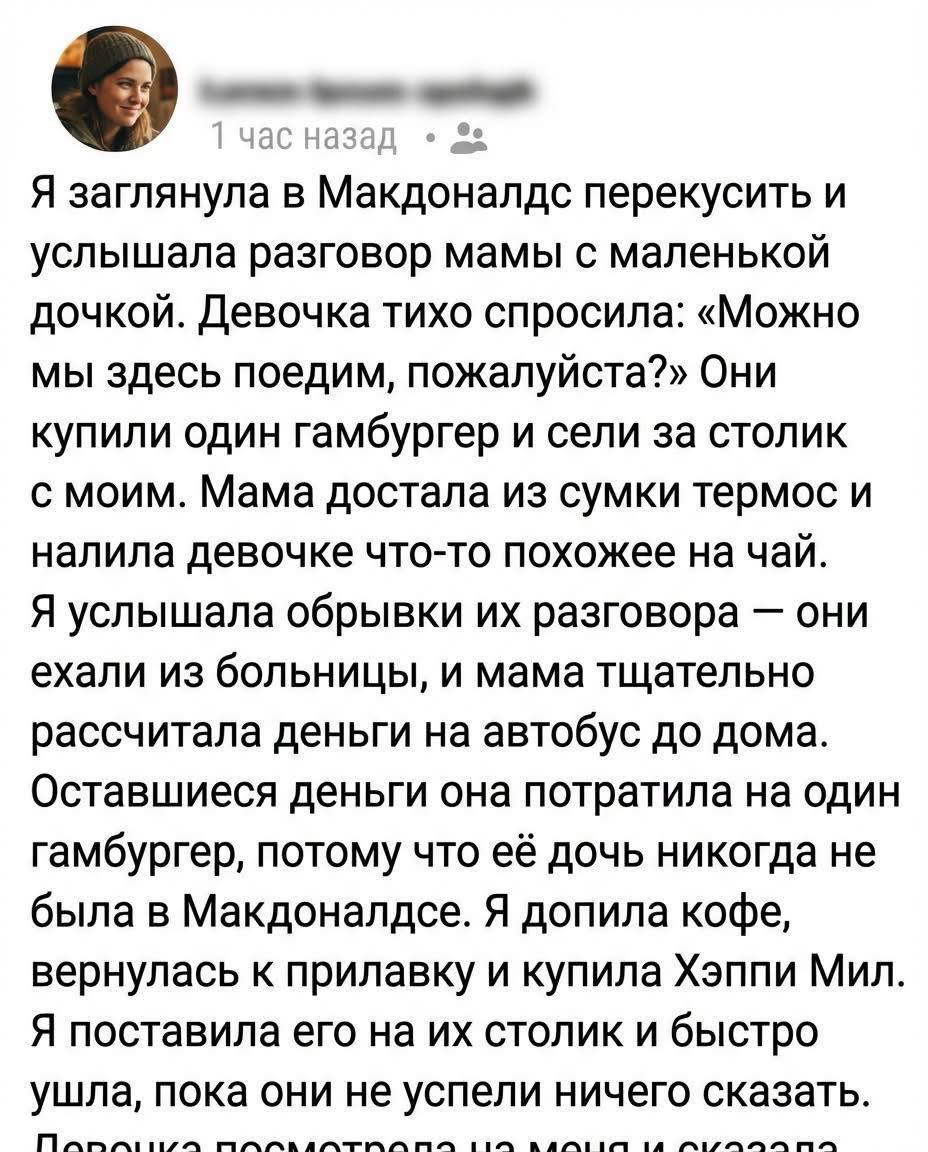И всё равно в голове крутились их слова про автобус, про больницу, про “осталось ровно на дорогу”. И как эта женщина, не поднимая глаз, делила гамбургер на маленькие кусочки, будто резала не еду — а свою вину перед ребёнком.