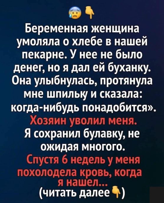 Беременная женщина со слезами на глазах просила хоть кусок хлеба в нашей пекарне. Денег у неё не было, и всё же я отдал ей свежую булку бесплатно. В ответ она тепло улыбнулась, протянула мне обычную шпильку и тихо сказала: «Она тебе ещё пригодится».