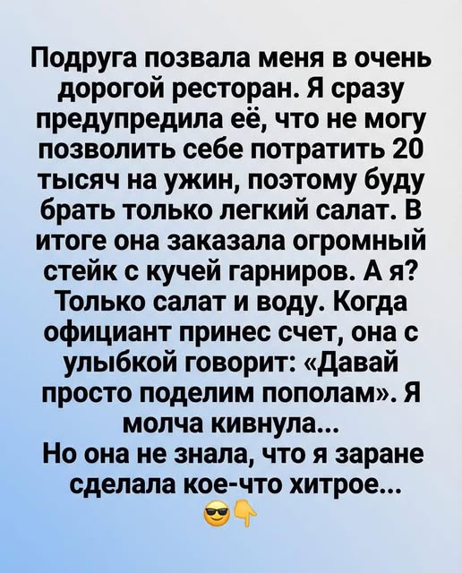 Я ела медленно, стараясь не обращать внимания на разницу. Мы разговаривали — о работе, о знакомых, о планах. Но где-то на фоне постоянно звучала мысль: «Как мы будем делить счёт?»