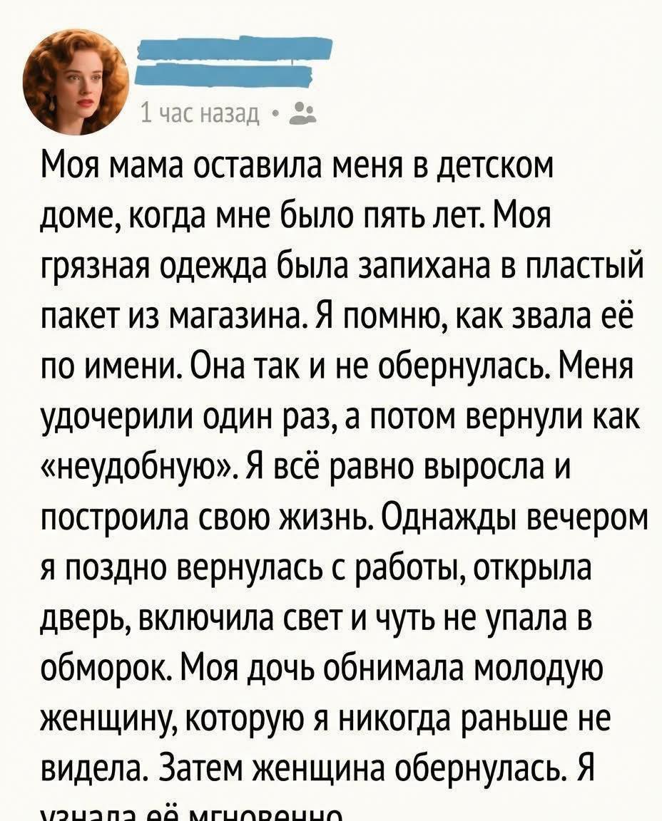 Передо мной стояла женщина, которая когда-то оставила пятилетнюю девочку в холодном коридоре детского дома и ушла, не оглянувшись.