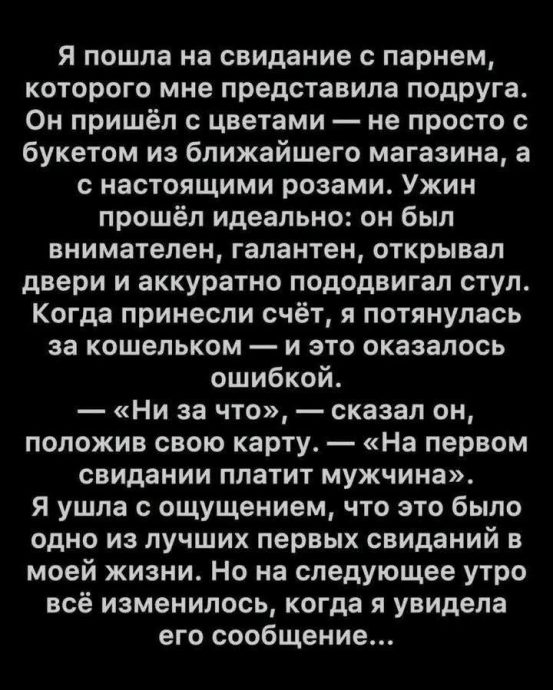 «Я мужчина. Я плачу на первом свидании. Но это не значит, что ты не должна участвовать. Переводи — буду ждать».