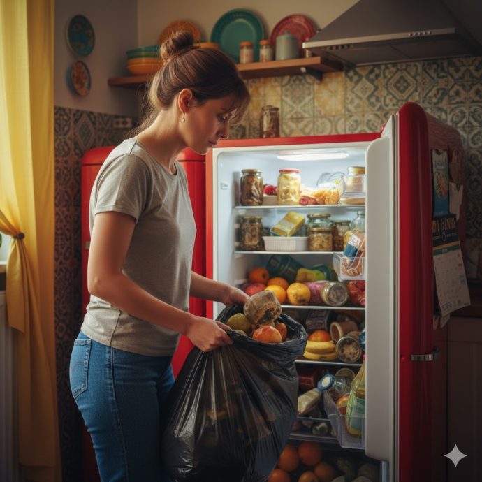 Первой в чёрную пасть мешка полетела колбаса. Она не стала её заворачивать, просто бросила, и батон глухо стукнулся о дно. Затем сосиски. За ними — все соусы, один за другим. Она не выдавливала их, не пыталась испортить — просто избавлялась от них, как от улик.