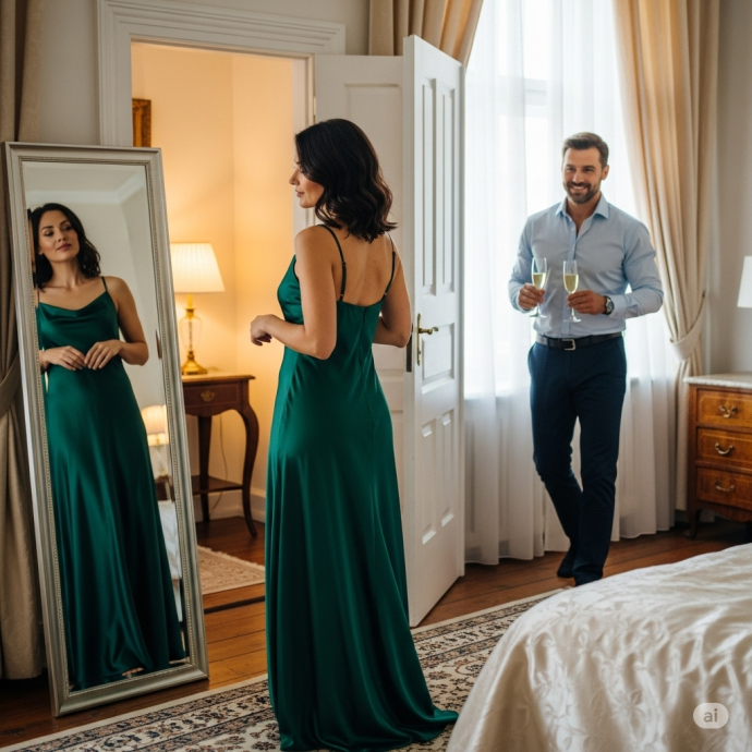 Он поставил бокалы на туалетный столик, его отражение на мгновение слилось с моим в зеркале. Я поправляла шелковое платье цвета ночного неба, и его теплый взгляд скользнул по моей спине.