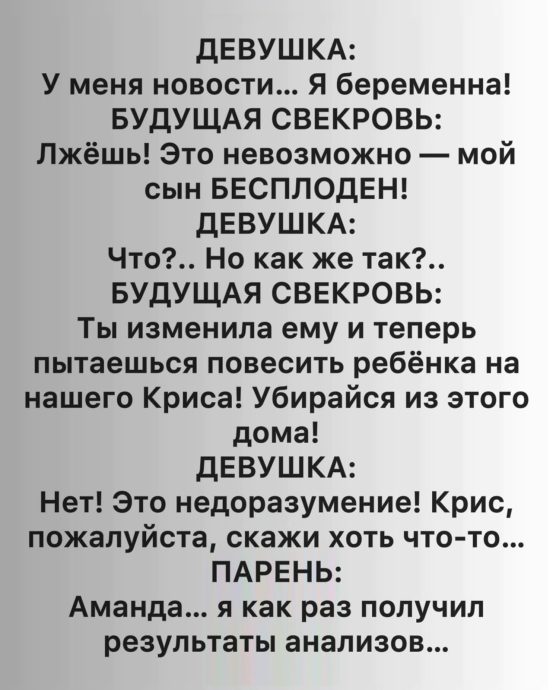— Какие ещё анализы? — спросила она с наигранным спокойствием. — Мы же всё давно знаем. Врачи ясно сказали: детей у тебя быть не может.