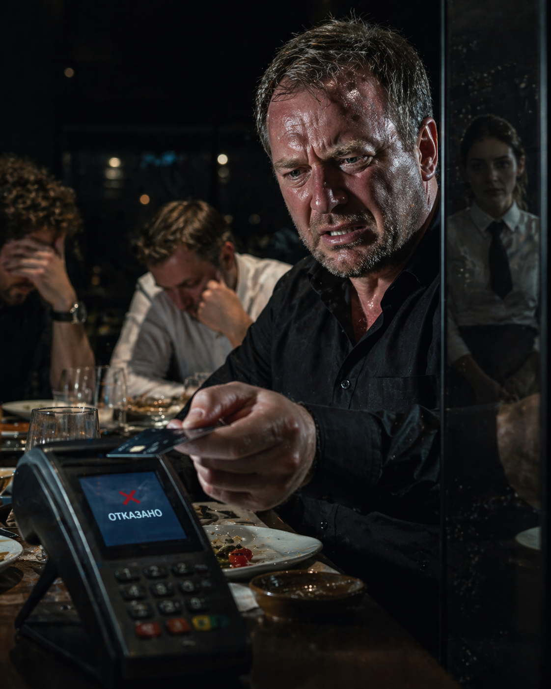 Он пробовал ещё раз. Снова отказ. Сидел с красным лицом, пока друзья в складчину оплачивали то, на что он их позвал.