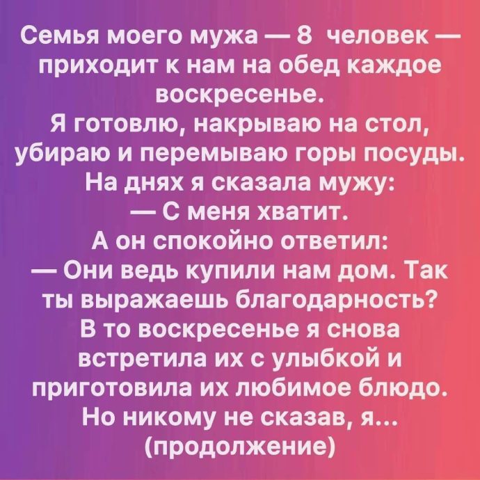 И так продолжалось — воскресенье за воскресеньем, слова за словами, улыбки за улыбками. Моя семья и я стали ближе, мы стали понимать друг друга глубже, а дом, в котором я когда-то уставала от бесконечных обязанностей, превратился в настоящий центр тепла, доверия и счастья.