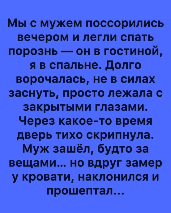 Мы с мужем поссорились вечером и легли спать порознь — он в гостиной, я в спальне. Долго ворочалась, не в силах заснуть, просто лежала с закрытыми глазами.
