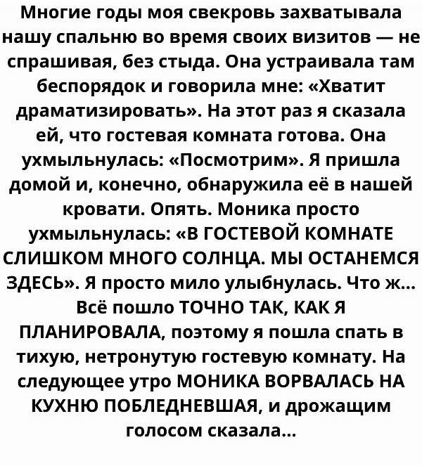 Каждый приезд начинался одинаково: она с шумом волокла сумки, ставила их прямо в коридоре, делала вид, будто умирает от усталости, а потом… без вопросов, без «можно?», без намёка на стеснение шла прямиком в нашу спальню. Как будто это её личный номер в гостинице, где мы — обслуживающий персонал.