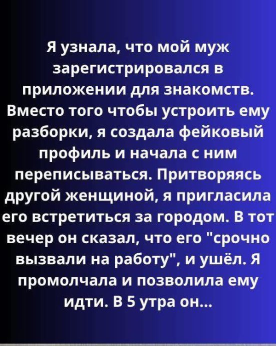Я не спала всю ночь. Лежала в темноте, слушая, как тикают часы на кухне, как скрипит лифт за стеной, как где-то внизу хлопает дверь подъезда. Каждая минута тянулась, как час. Я знала: если он действительно «на работе», он бы уже написал. Хоть что-нибудь. Но телефон молчал.
