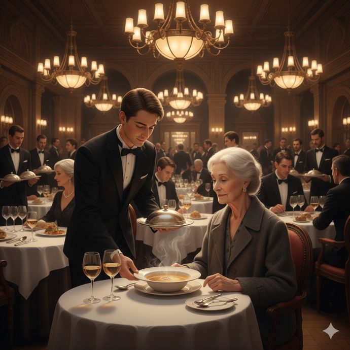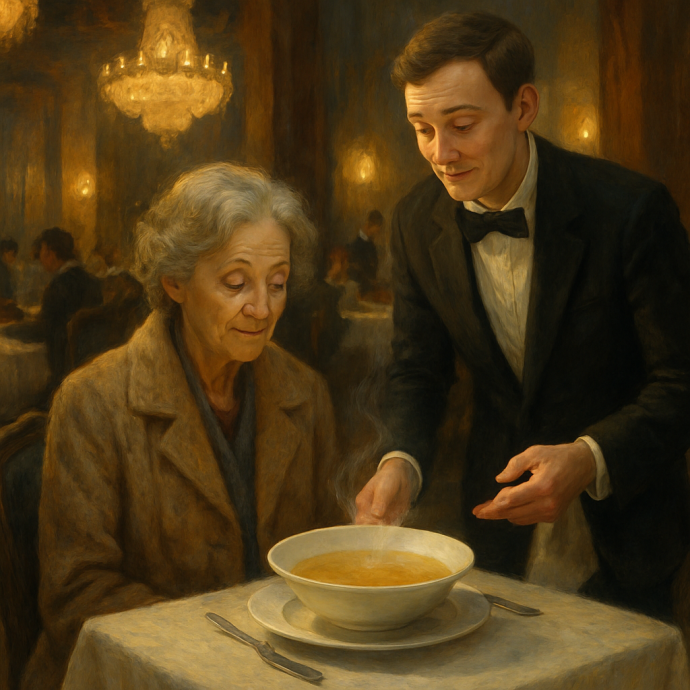 Через полчаса хозяйка ресторана, мадам Элоиза, прошла мимо и взглянула на посетительницу. Женщина всё ещё сидела — неторопливо пила суп, в её взгляде было что-то странное: не смирение, не горечь, а покой.