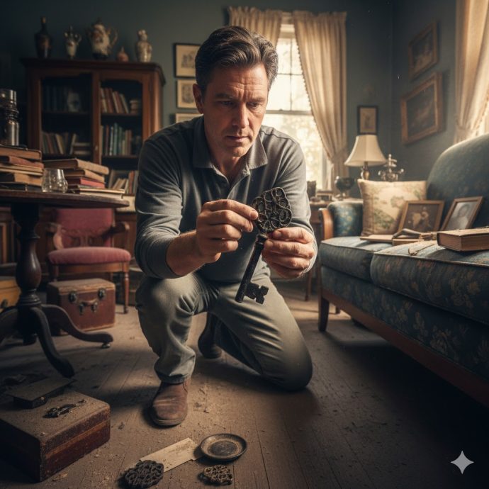 Я замер, глядя на пол. Под ногами лежал небольшой металлический предмет, покрытый пылью. Наклонившись, я осторожно поднял его. Это был старинный ключ — тяжёлый, с узорчатой головкой, потемневший от времени.