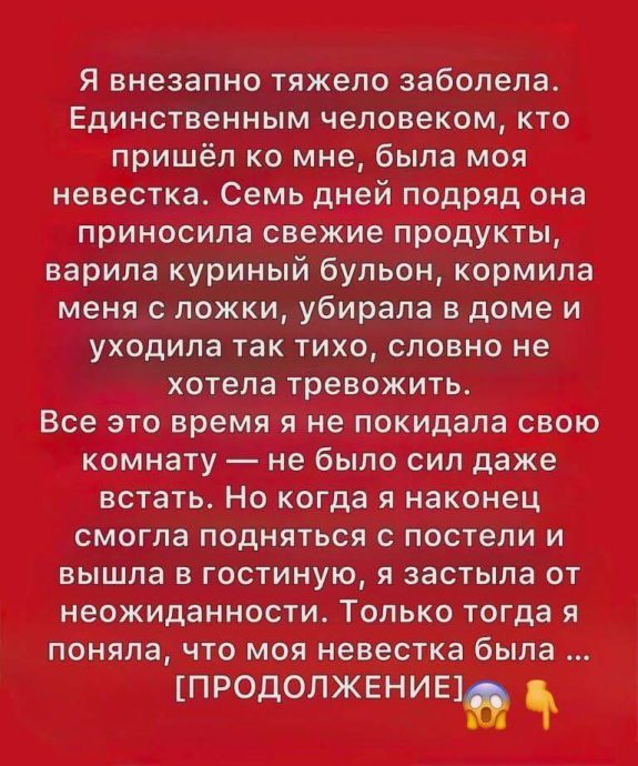Единственным человеком, кто пришёл ко мне, была моя невестка. Семь дней подряд она приносила свежие продукты, варила куриный бульон, кормила меня с ложки, убирала в доме и уходила так тихо, словно не хотела тревожить.