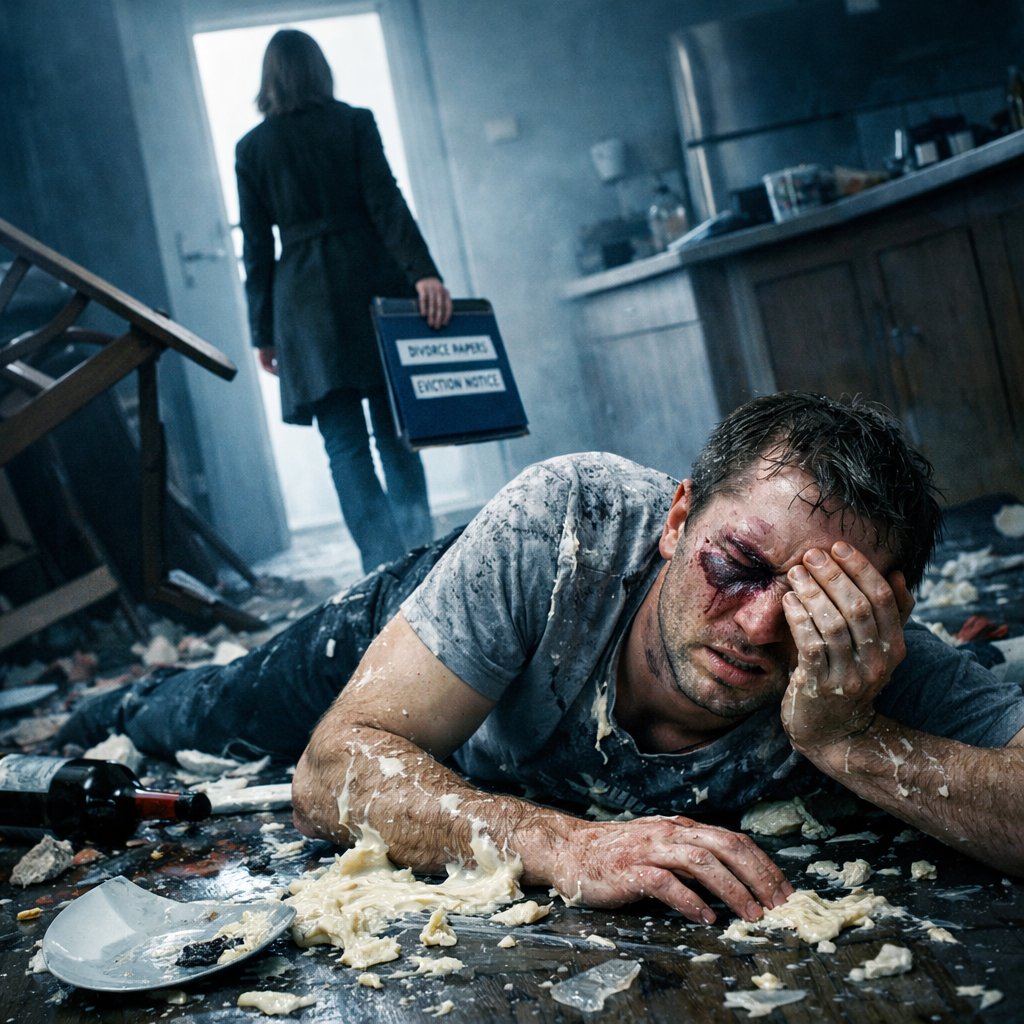Маша дышала тяжело, её трясло, но не от страха, а от адреналина. Она поправила пиджак, глядя на мужа, валяющегося в майонезе и осколках.