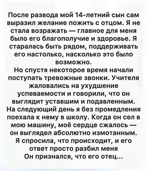 После развода мой четырнадцатилетний сын сам сказал, что хочет пожить у отца. Я не стала перечить — его спокойствие и внутренний комфорт всегда были для меня важнее собственных чувств. Я лишь попросила разрешить мне видеть его так часто, как он сам захочет, и старалась быть рядом настолько, насколько мне позволяли обстоятельства.