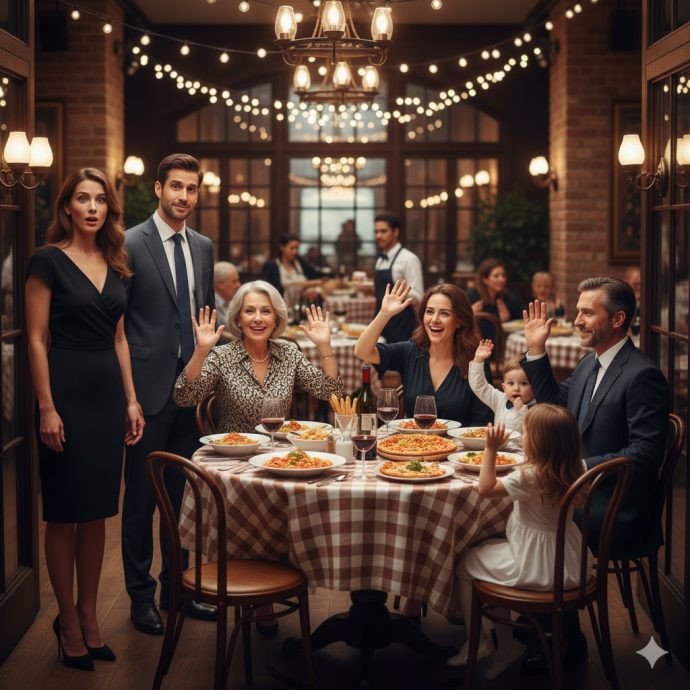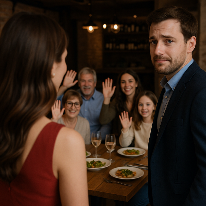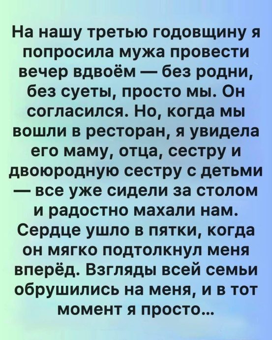 На нашу третью годовщину я попросила мужа провести вечер вдвоём — без родни, без суеты, просто мы. Он согласился. Но когда мы вошли в ресторан, я увидела его маму, отца, сестру и двоюродную сестру с детьми — все уже сидели за столом и радостно махали нам.