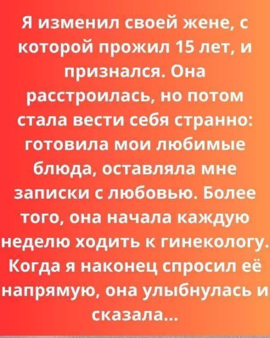 Я не мог понять, что происходит. Она больше не спрашивала, где я был, не проверяла телефон, не говорила о “той женщине”.