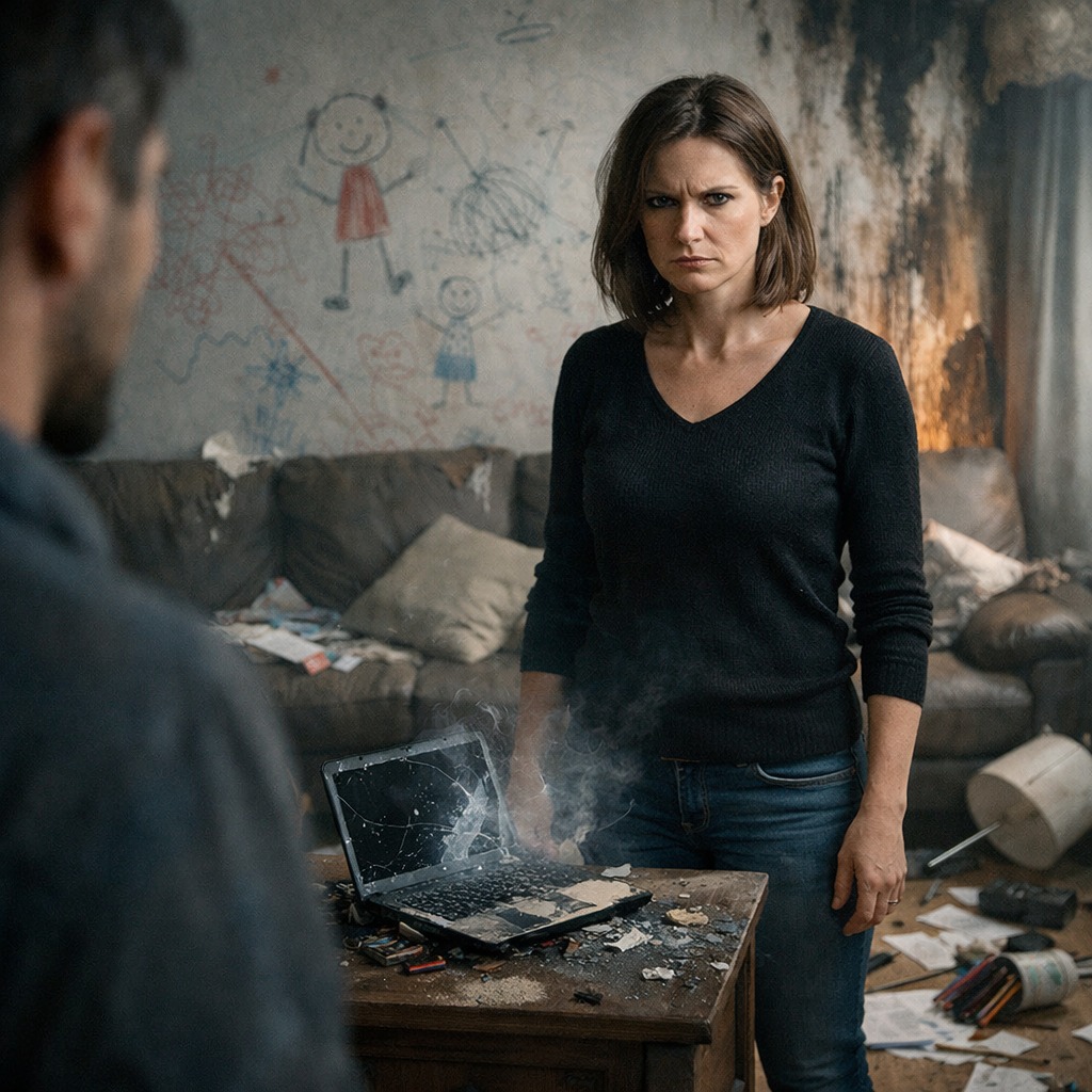 Она стояла в узком коридоре, преграждая мужу путь, и держала в руках то, что еще утром было её рабочим инструментом. Тонкий серебристый корпус ноутбука теперь напоминал жертву автомобильной аварии: экран пошел паутиной трещин, из которой, словно выбитые зубы, торчали осколки матрицы, а клавиатура выглядела как вспаханное поле — половина кнопок была выдрана с мясом и теперь сиротливо валялась где-то в недрах гостиной.