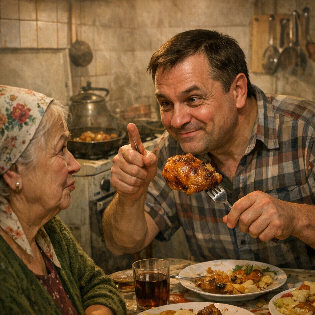 Станислав назидательно погрозил вилкой теще, Валентине Петровне, и тут же подцепил с тарелки самый большой, поджаристый кусок курицы. В тесной кухне двухкомнатной хрущевки стоял тяжелый, въедливый запах жареного лука и дешевого освежителя воздуха «Морской бриз». Низкий потолок, казалось, давил на макушку, а старый холодильник «Саратов» в углу рычал, как цепной пес, заглушая звуки с улицы.