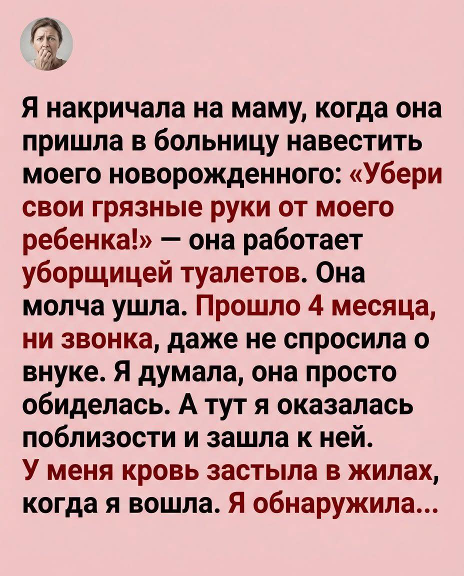 Четыре месяца. Четыре долгих месяца я жила, убеждая себя, что она просто обиделась. Что она гордая. Что она всегда такой была — тихо уходила, когда ей было больно. Я даже злилась на неё: «Ну и пусть, раз не хочет видеть внука — её дело». Но сейчас, стоя у этой двери, я впервые почувствовала не злость, а страх.
