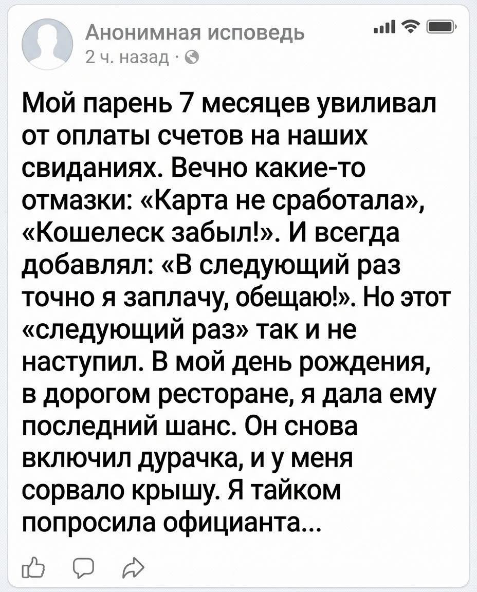 Я сказала это тихо, почти шёпотом, наклонившись к официанту, пока мой парень увлечённо рассказывал какую-то очередную историю — на этот раз о том, как его «задержали на работе», из-за чего он, конечно же, не успел снять наличные. Я даже не слушала. Слова скользили мимо меня, как дождь по стеклу. Всё это я уже слышала десятки раз.